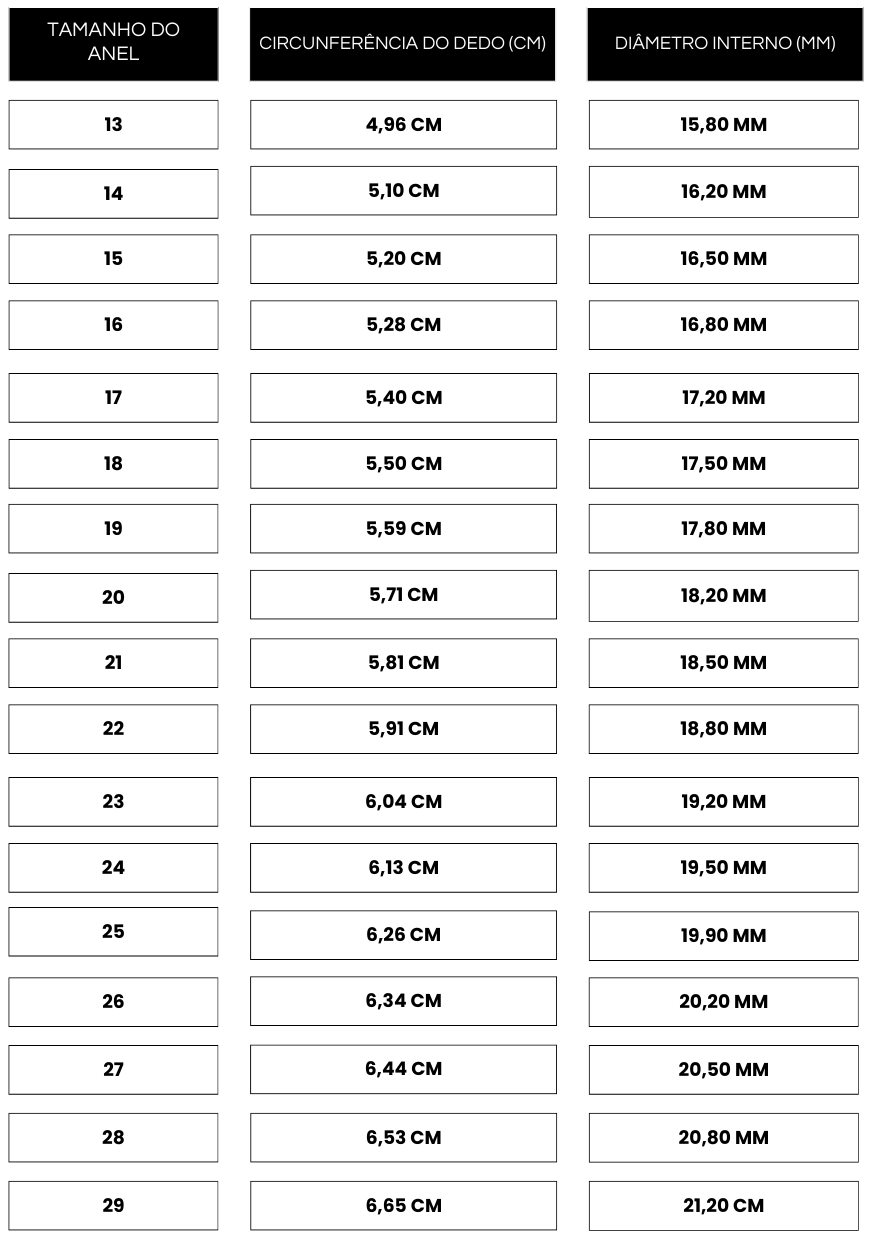 Se você medir 6,04 cm de circunferência no seu dedo, o tamanho correspondente do seu anel será 23.