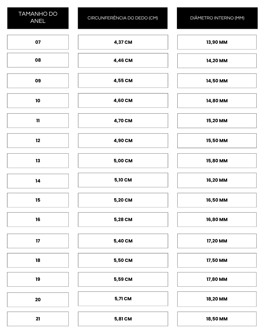 • Compare com a tabela abaixo para encontrar o tamanho correspondente do anel.