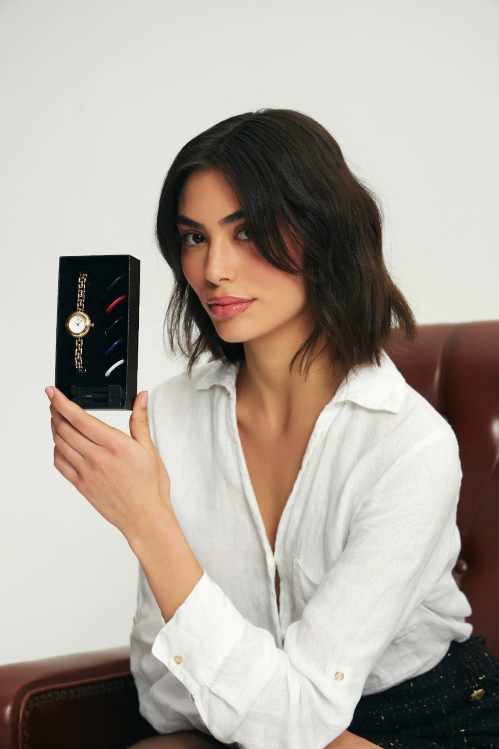 Sua caixa dourada de acabamento refinado e pulseira com elos clássicos traduzem elegância e atemporalidade. O grande diferencial está nos 6 biséis coloridos intercambiáveis, que permitem transformar o visual do relógio conforme o look, o mood ou a ocasião.