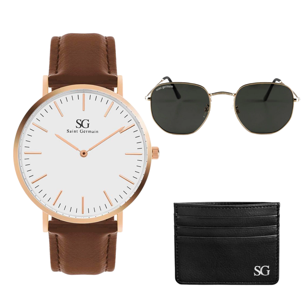 O Kit inclui o Relógio Saint Germain Bronx Rosé Gold 40mm de diâmetro, vidro com mineral endurecido com alta resistência + Carteira slim de courino preto feito a mão com design exclusivo Saint Germain + Óculos de Sol Harbor Green Gold com lentes de proteção UV400 + Caixa de Presente.