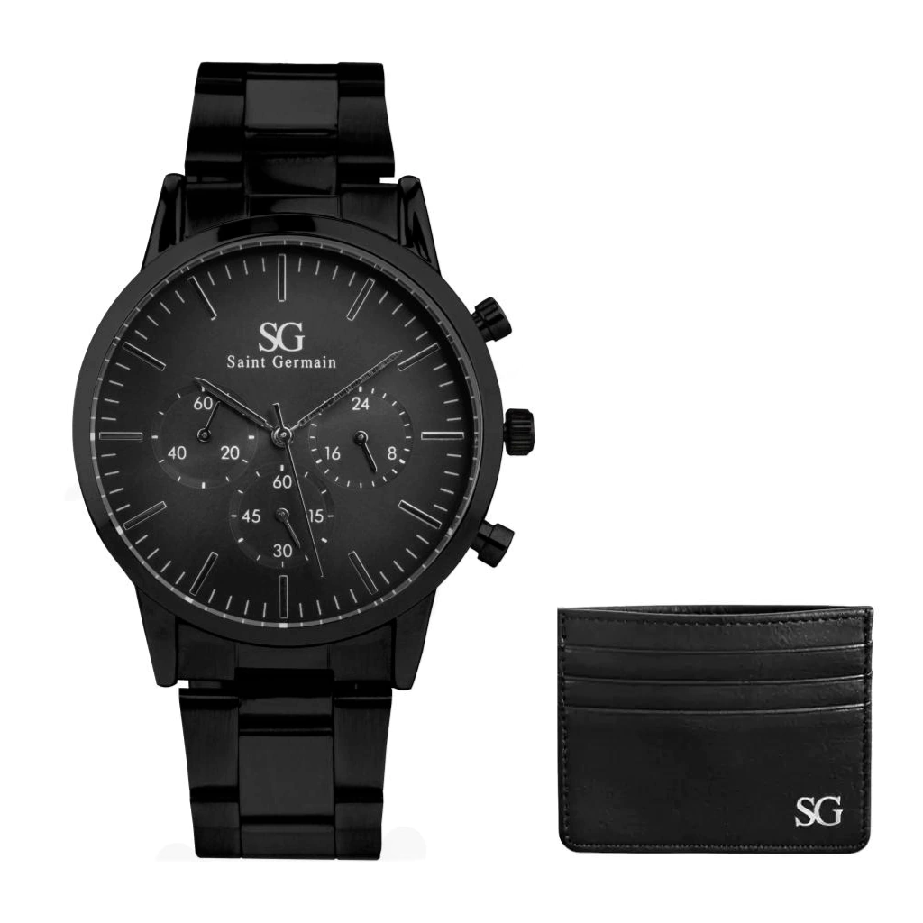 O Kit inclui o Relógio Saint Germain Chrono Full Black 42mm de diâmetro, vidro com mineral endurecido com alta resistência + Carteira slim de courino preto feito a mão com design exclusivo Saint Germain + Caixa de Presente.