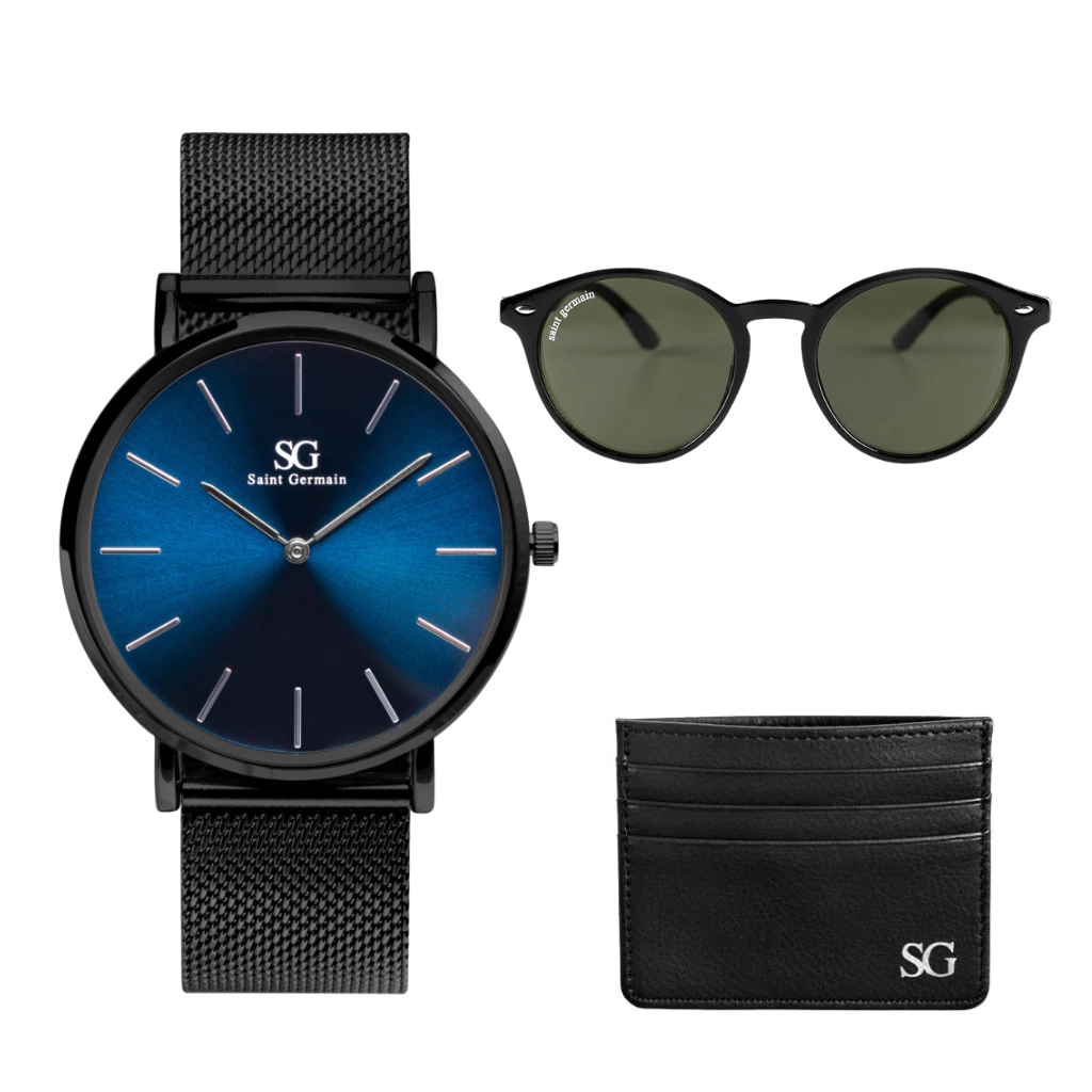 O Kit inclui o Relógio Saint Germain Houston Full Blue 40mm de diâmetro, vidro com mineral endurecido com alta resistência + Carteira slim de courino preto feito a mão com design exclusivo Saint Germain + Óculos de Sol Lincoln Green Black com lentes de proteção UV400 + Caixa de Presente.