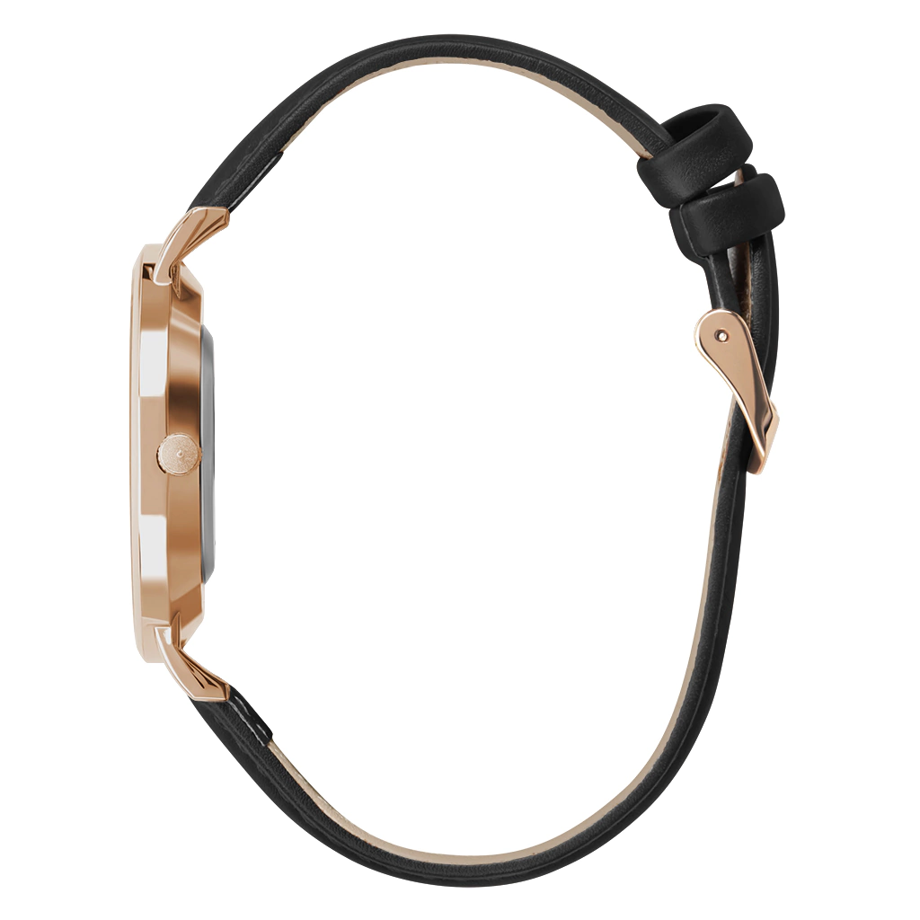 Relógio Feminino Saint Germain Preto Pulseira De Couro Sintético Murray Black Rosé Gold 32mm de diâmetro. A caixa é de metal rosé gold e o mostrador preto, vidro com mineral endurecido com alta resistência.