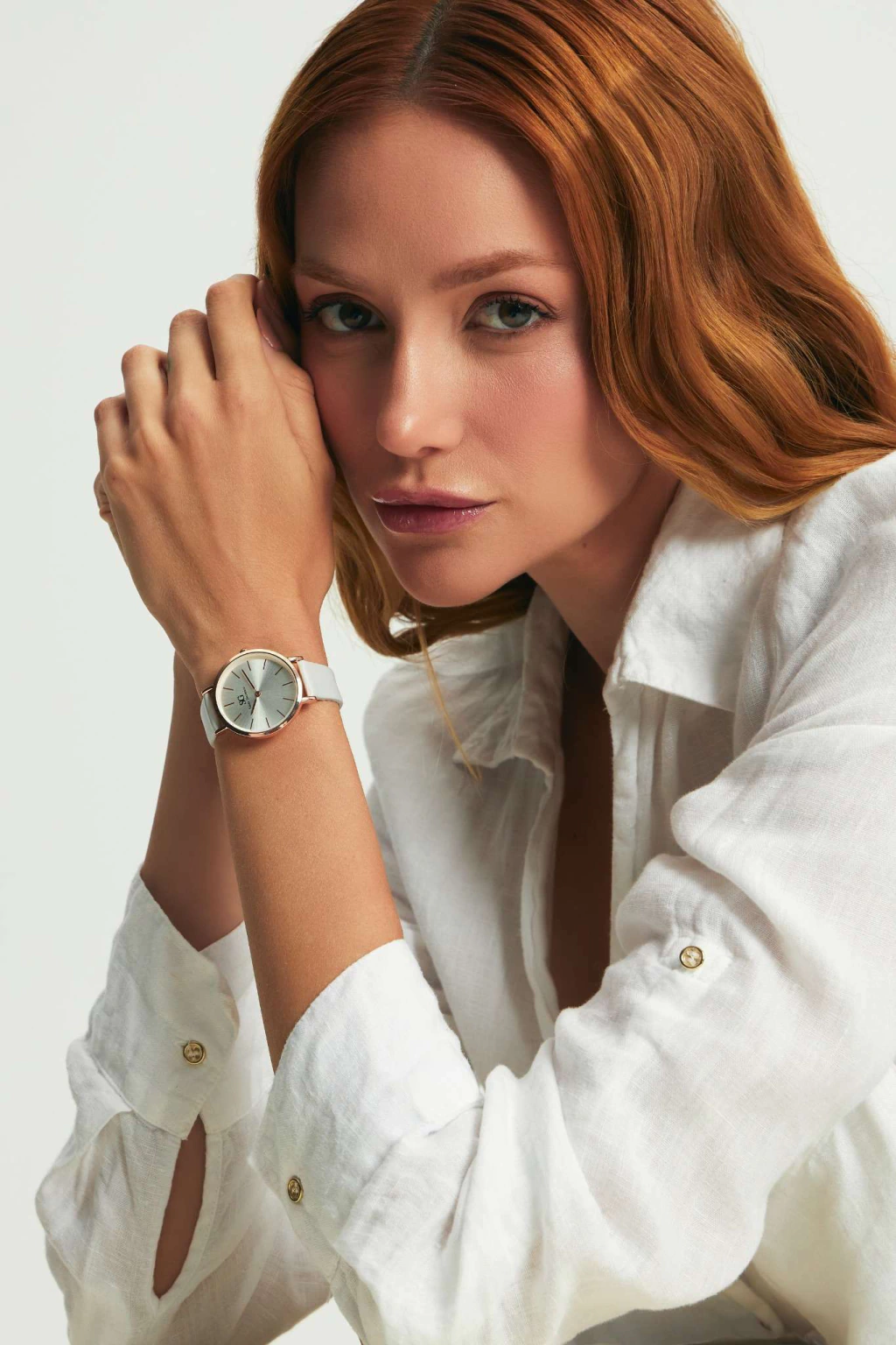 Seu acabamento limpo e detalhes rosé transmitem suavidade visual, tornando-o ideal para compor produções elegantes no trabalho, em encontros casuais ou até em eventos especiais. A pulseira de couro branco, macia e confortável, adiciona leveza ao pulso com charme e discrição.
