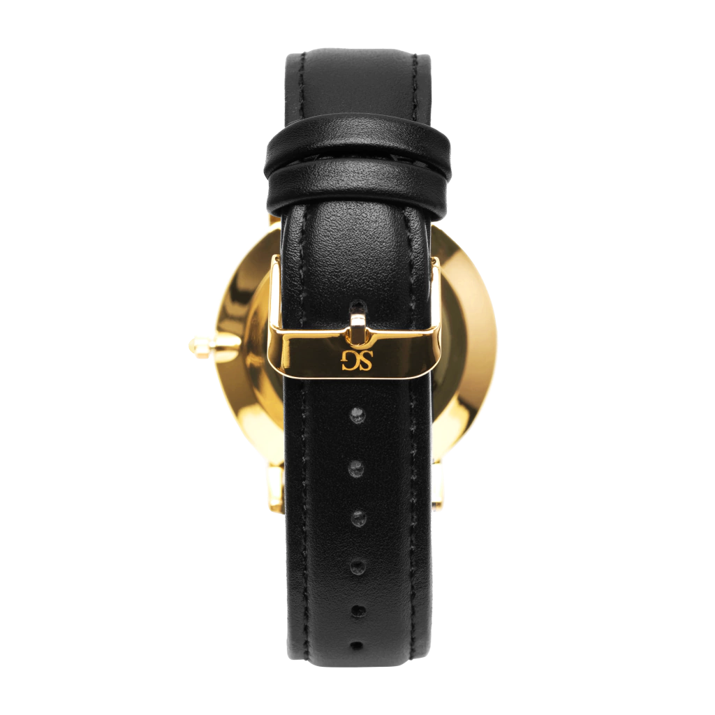 Relógio minimalista feminino Saint Germain pulseira preta de couro Murray Full Gold 32mm de diâmetro. A caixa é de metal dourado e o mostrador shine dourado, vidro com mineral endurecido com alta resistência.