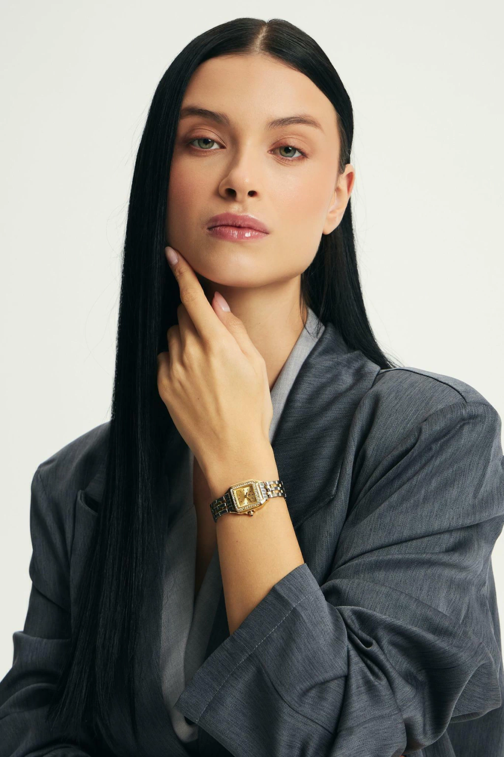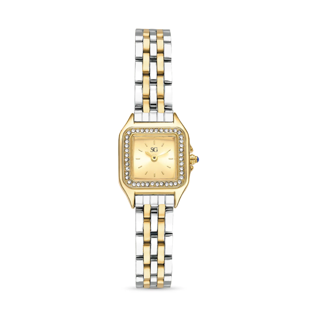 Combinando elegância e versatilidade, este modelo bicolor é perfeito para diferentes ocasiões, do dia a dia a eventos especiais. Os cristais cravejados na caixa adicionam um toque de brilho sofisticado, enquanto o formato quadrado traz modernidade ao design.