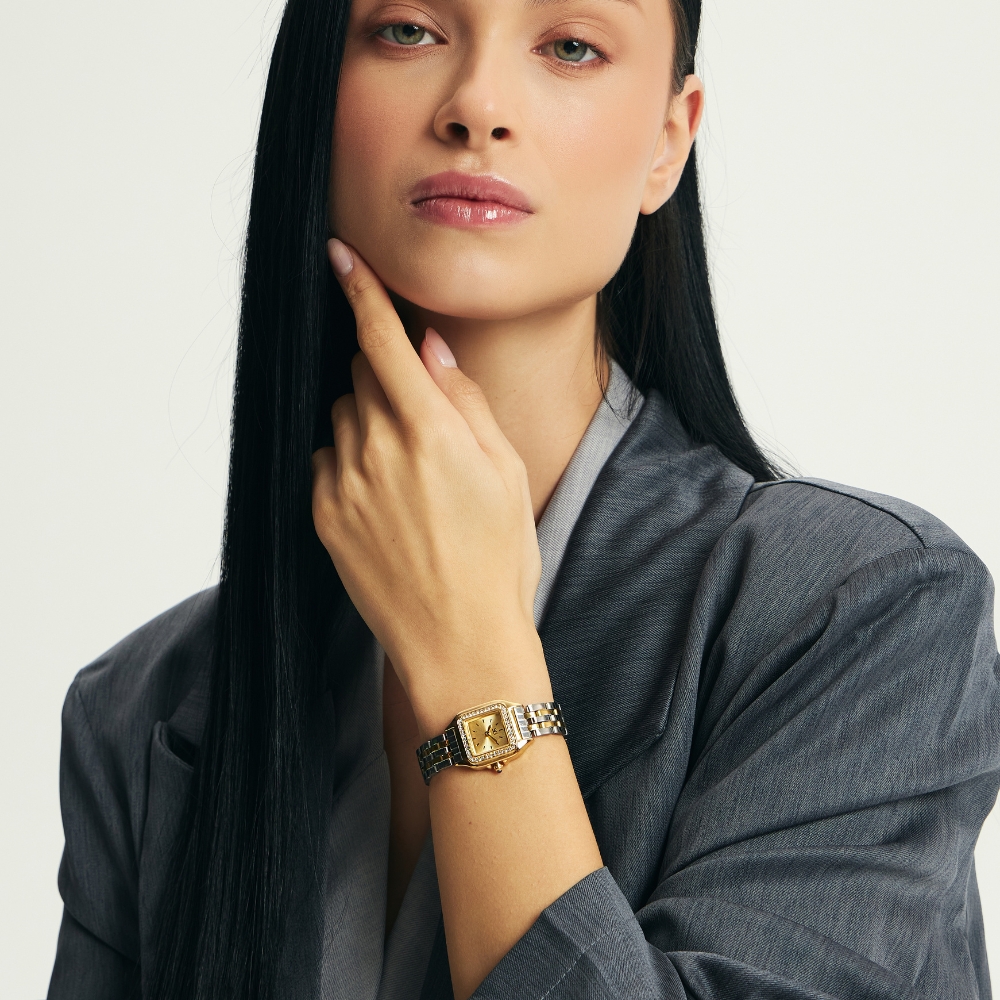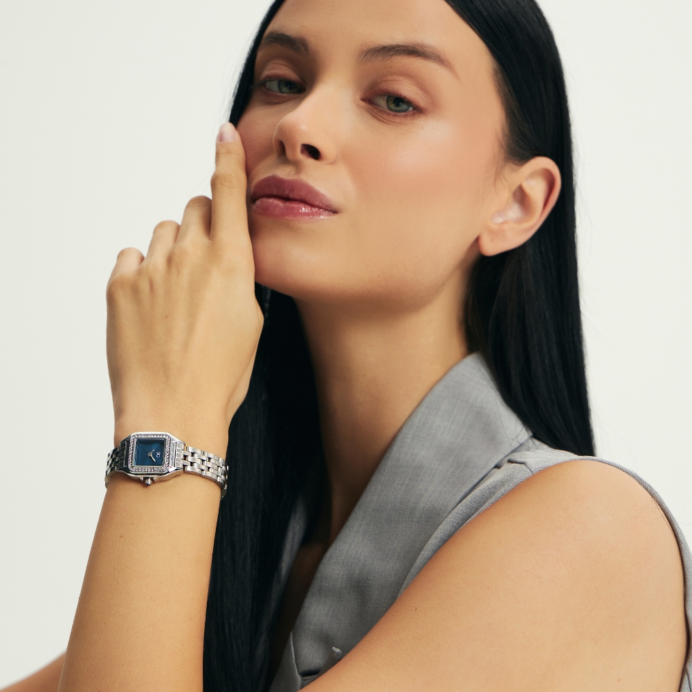 Combinando o clássico e o contemporâneo, este modelo é ideal para mulheres que apreciam acessórios discretos, porém marcantes. Seu formato quadrado traz modernidade, enquanto o mostrador preto adicionou uma sofisticação atemporal.