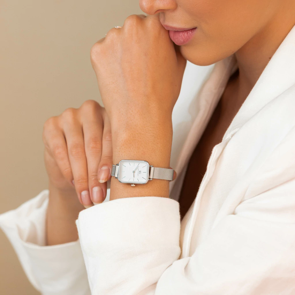 Relógio Feminino Saint Germain Quadrado Square Harlem Silver com pulseira de aço inoxidável prata possui 20x26mm de tamanho da caixa. A caixa é metal prata e o mostrador branco, vidro com mineral endurecido com alta resistência.