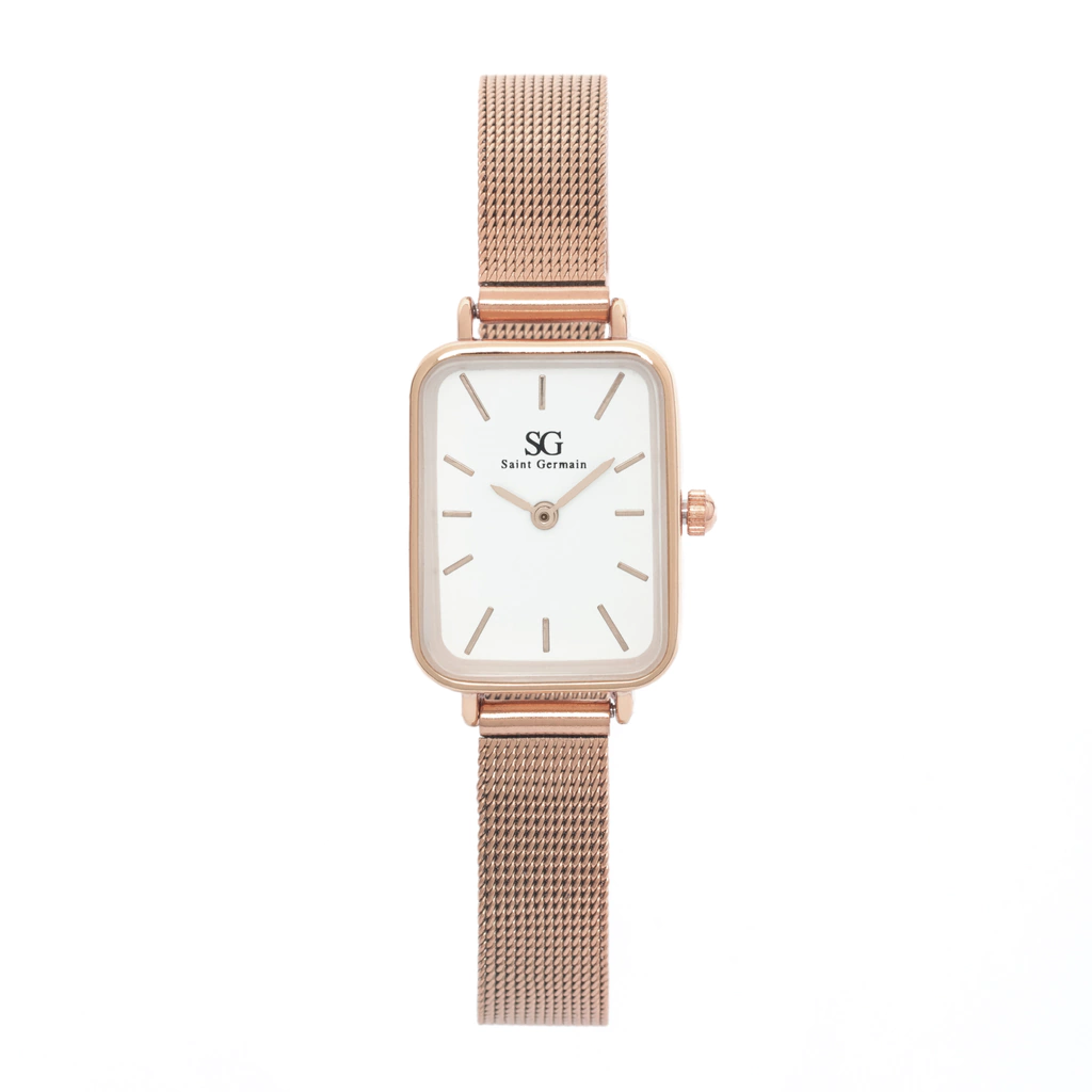 Relógio Feminino Saint Germain Quadrado Square Nolita Rosé Gold com pulseira de aço inoxidável rosé gold possui 20x26mm de tamanho da caixa. A caixa é metal rosé gold e o mostrador branco, vidro com mineral endurecido com alta resistência.