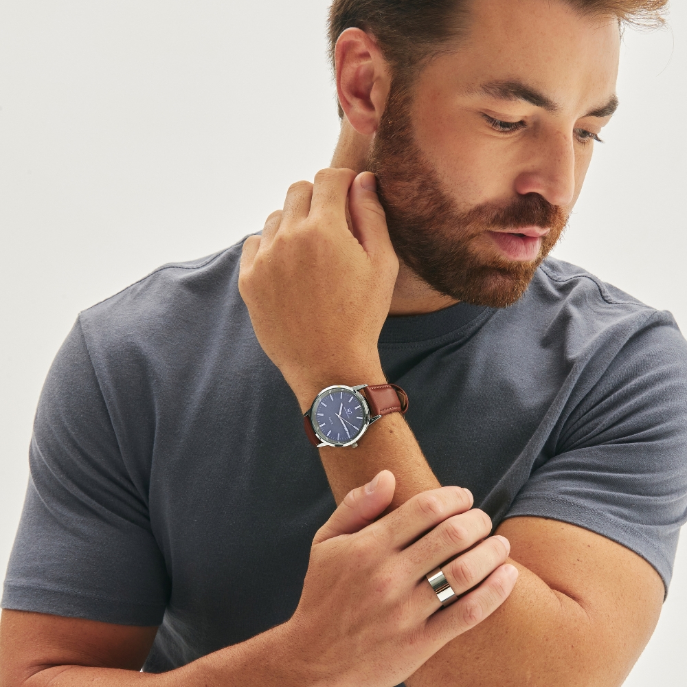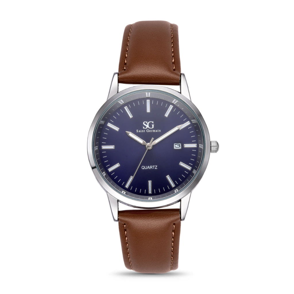 Seu mostrador azul profundo contrasta harmoniosamente com a caixa prateada e os detalhes luminosos nos marcadores e ponteiros, garantindo ótima visibilidade em qualquer ambiente. A pulseira de couro marrom adiciona um toque de refinamento e conforto, proporcionando um ajuste perfeito ao pulso.