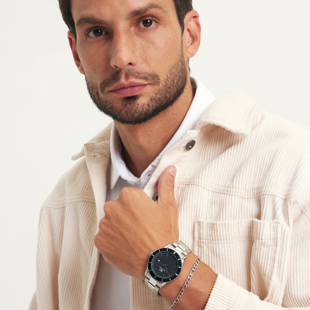 O Relógio Masculino Redondo Belmont Date Prata com Fundo Preto traz um design moderno com visual marcante. Sua caixa redonda de 42 mm e o mostrador preto contrastante transmitem elegância e presença. A pulseira prata reforça o estilo contemporâneo e robusto, ideal para quem busca um relógio de pulso masculino que combine com diferentes estilos. Com função calendário e movimento a quartzo, é um modelo versátil e funcional para o dia a dia.