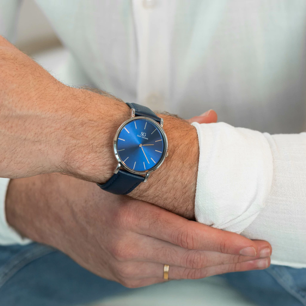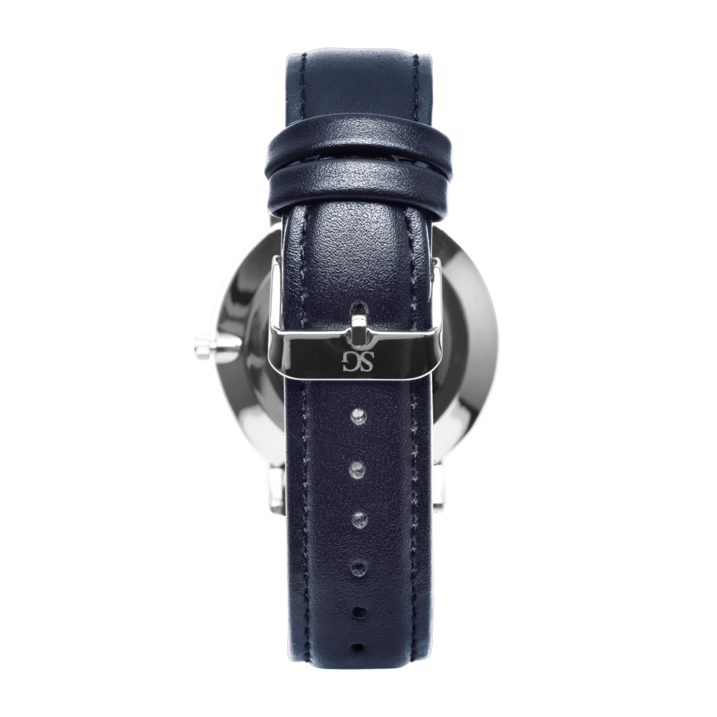 Relógio Minimalista Saint Germain Azul Pulseira De Couro Sintético Riverdale Blue Silver 40mm de diâmetro. A caixa é de metal prateada e o mostrador azul shine, vidro com mineral endurecido com alta resistência.
