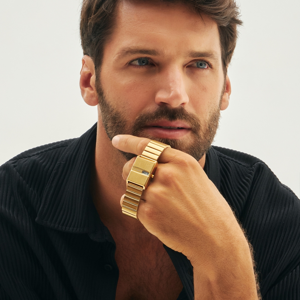 Sua caixa retangular com acabamento escovado dourado traz um toque de elegância contemporânea, enquanto a pulseira metálica completa o visual com sofisticação. Versátil e cheio de estilo, é ideal para compor looks modernos em diversas ocasiões. Um relógio que une funcionalidade com um visual futurista e imponente.