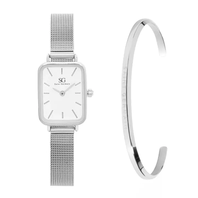 O Kit contém o Relógio Saint Germain Quadrado Square Harlem Silver com pulseira de aço, possui 20x26mm de diâmetro com a caixa de metal prateada e o mostrador preto, vidro com mineral endurecido com alta resistência + o nosso clássico bracelete Prata de PI aço inoxidável que foi desenhado para refletir a beleza cativante dos nossos relógios minimalistas.