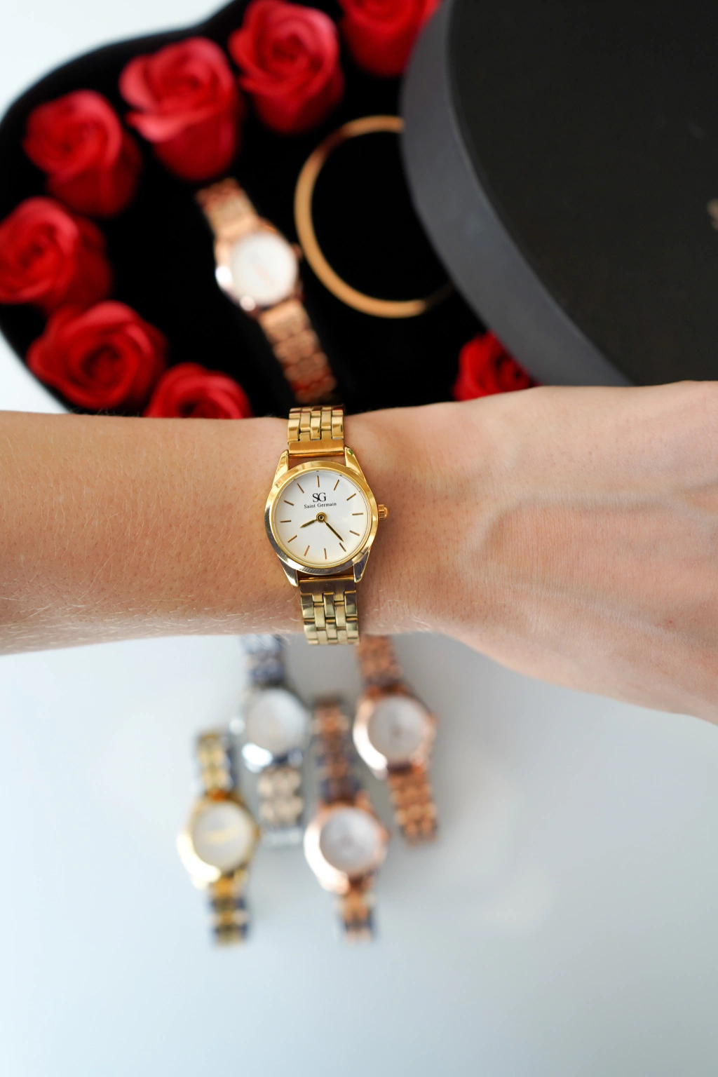 O Kit acompanha nossa Caixa Coração perfeita para presentear em momentos especiais, o Relógio Saint Germain Mini Belle Gold com 24mm, a caixa é de metal e o mostrador de vidro com mineral endurecido de alta resistência. Juntamente com o nosso clássico Bracelete Gold, ambos de PI aço inoxidável.