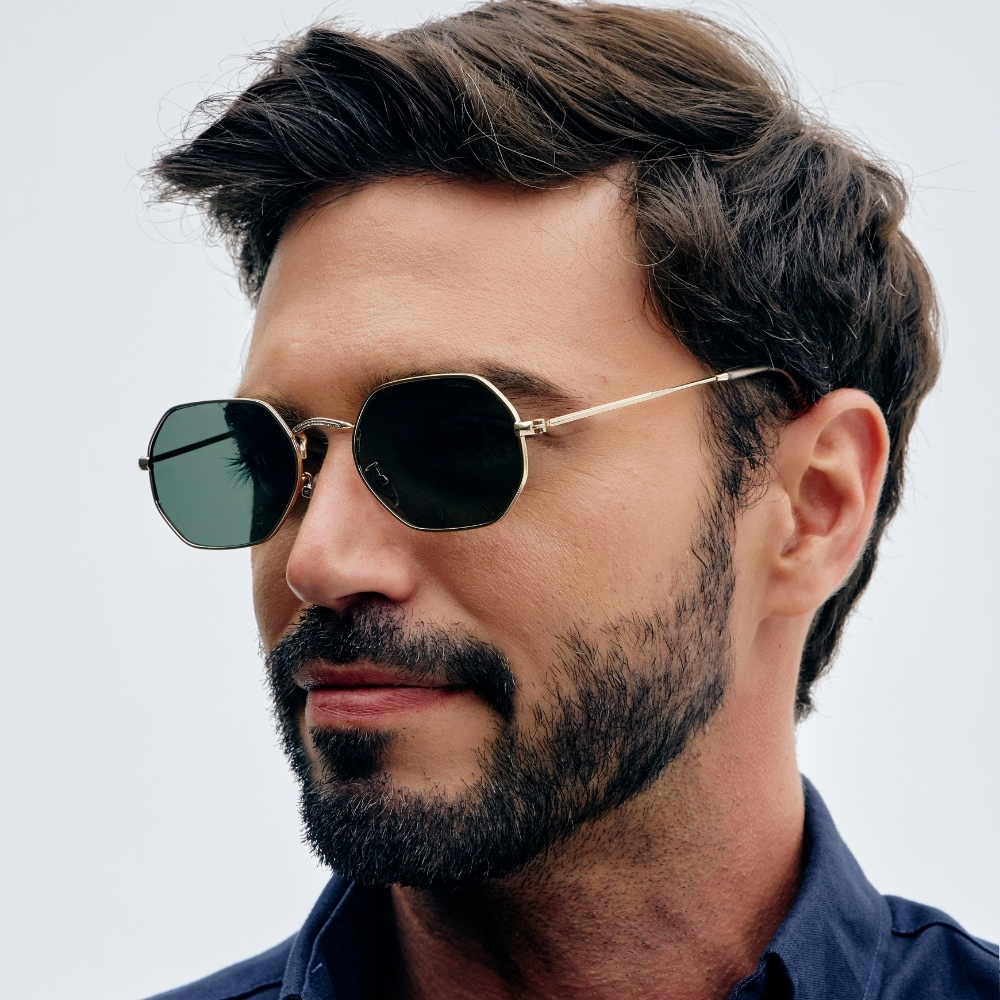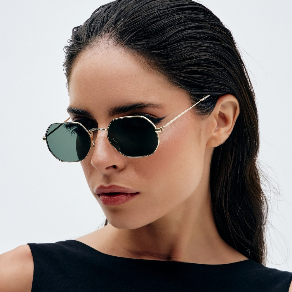 - Design geométrico sofisticado: armação dourada com lentes pretas elegantes.