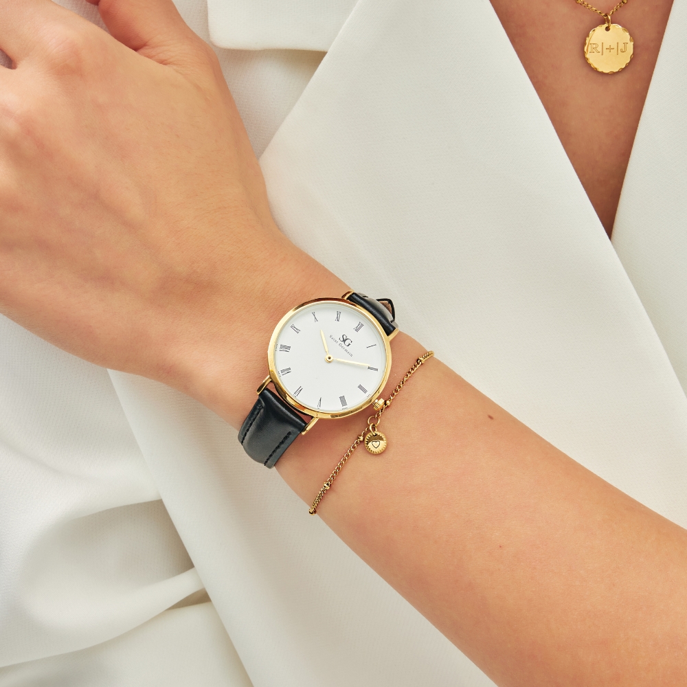 O Relógio Feminino Murray Romain Dourado 32mm da Saint Germain é a definição de sofisticação atemporal. Com caixa dourada de 32mm e mostrador branco clássico com marcadores em números romanos, esse modelo une design tradicional e refinamento em cada detalhe.