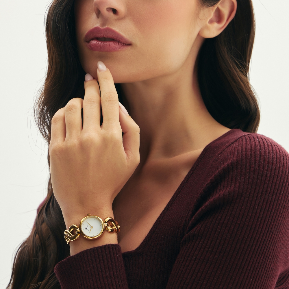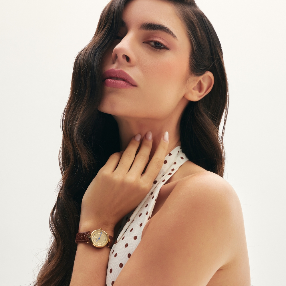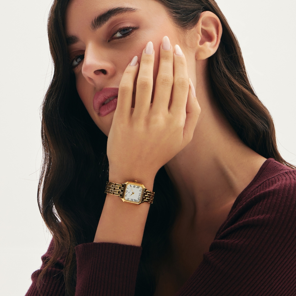 Este modelo reúne o charme clássico dos relógios com números romanos ao visual requintado da caixa dourada. Sua estética vintage o torna uma peça versátil, ideal para quem busca um relógio feminino, quadrado e atemporal.