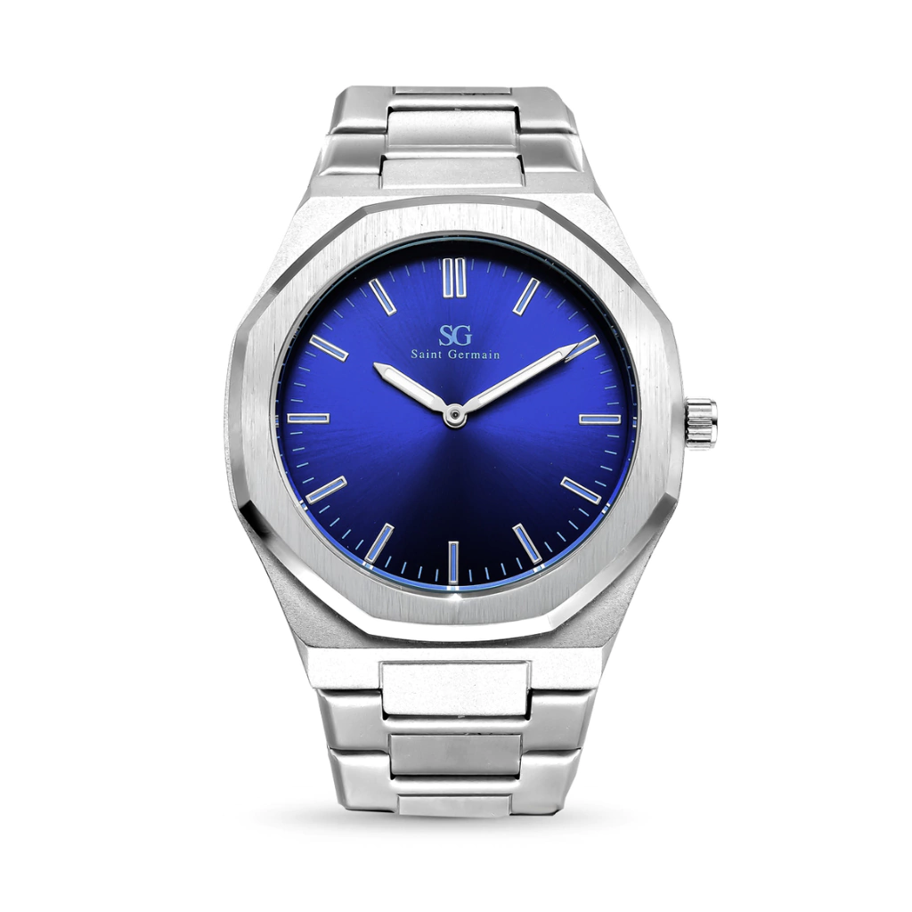 O Hudson Blue Silver, da Saint Germain, é um relógio masculino que traduz sofisticação, força e estilo contemporâneo. Com caixa robusta de 42mm e acabamento em aço escovado, ele foi feito para homens que valorizam a presença marcante e o design de impacto.