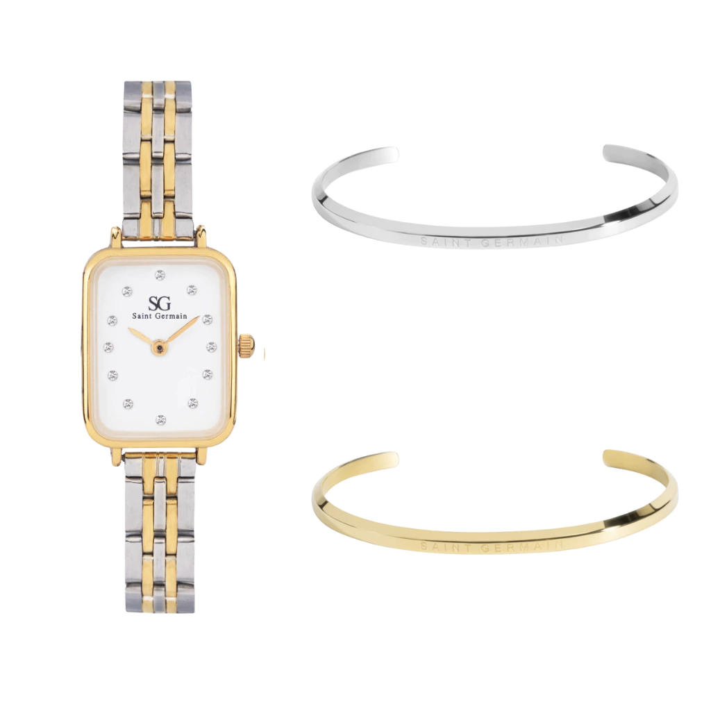 O Kit inclui o Relógio Square Madison Bicolor Gold 20X26mm de diâmetro, vidro com mineral endurecido com alta resistência + Bracelete Dourado + Bracelete Prata + Caixa de Presente.